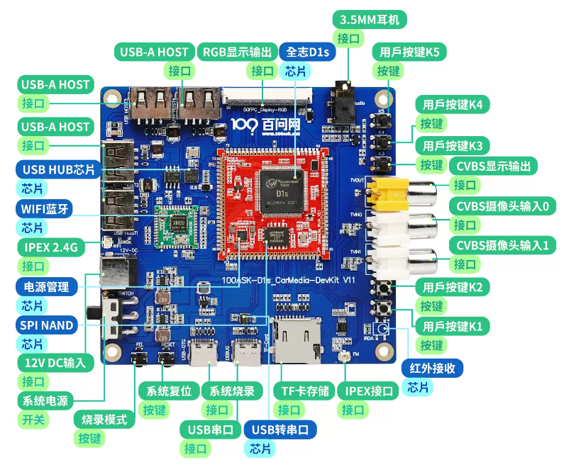 - USB TYPE-A HOST接口:用于连接 标准的 USB设备,比如 U盘 支持UVC的摄像头 等等设备。
