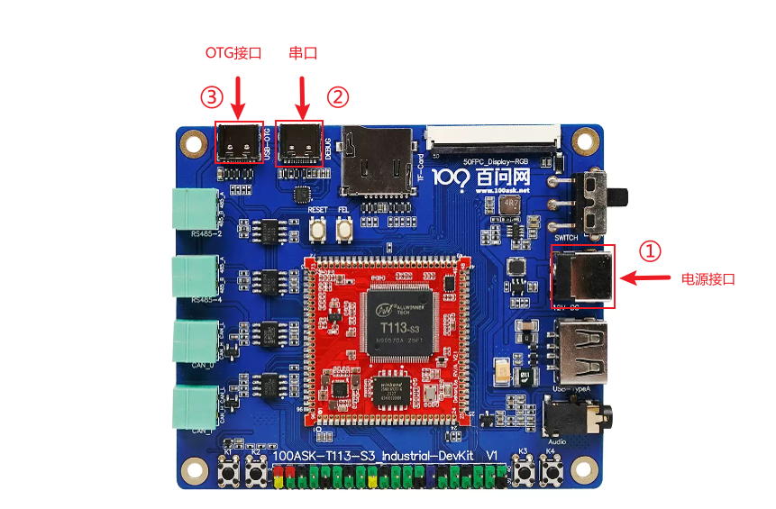 接入①12v电源、③USB-OTG和②USB串口。拨动电源开关,即可启动开发板。